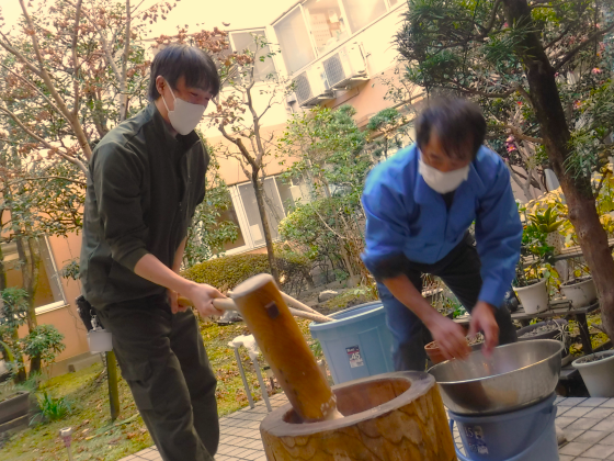 今年も万寿園では、年末の風物詩となっている餅つき大会を開催しました。