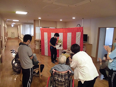 令和2年9月21日、敬老の日に、各フロア(西棟)・各ユニット(東棟)でお祝いをさせていただきました。三密を避ける為、例年のように一つの場所に集まる形での式典は行えませんでしたが、普段から馴染みの顔ぶれによるお祝いは、ゆったりと時間が過ぎ、温かい雰囲気でした。今年、節目の年にあたる方は14名いらっしゃり、最高齢の方は103歳でした。